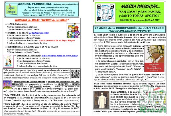 2227 4 enero 2026 NUESTRA PARROQUIA SAN COSME Y SAN DAMIÁN Y SANTO TOMÁS APÓSTOL –25 AÑOS de la EXHORTACIÓN de JUAN PABLO II “NOVO MILLENNIO INEUNTE”