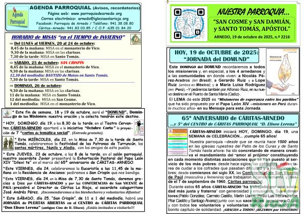 2216 19 OCTUBRE 2025 NUESTRA PARROQUIA SAN COSME Y SAN DAMIÁN Y SANTO TOMÁS APÓSTOL –HOY, 19 de OCTUBRE de 2025: “JORNADA del DOMUND”