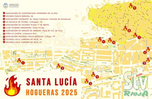 Como manda la tradición, en la tarde-noche de este viernes 12 de diciembre, víspera de Santa Lucía, un total de diez hogueras se prenderán en diversos puntos de Arnedo de la mano de asociaciones y colectivos arnedanos, así como de distintos particulares que pueden consultarse en el siguiente plano.