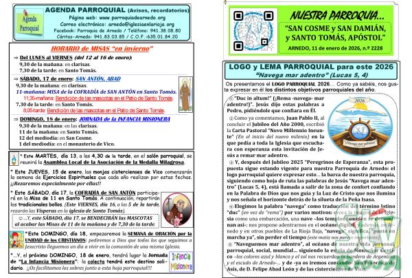 2228 11 enero 2026 NUESTRA PARROQUIA SAN COSME Y SAN DAMIÁN Y SANTO TOMÁS APÓSTOL –LOGO y LEMA PARROQUIAL para este 2026 “ Navega mar adentro” (Lucas 5, 4)