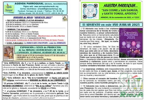2222 30 noviembre 2025 NUESTRA PARROQUIA SAN COSME Y SAN DAMIÁN Y SANTO TOMÁS APÓSTOL –El ADVIENTO en este AÑO JUBILAR 2025